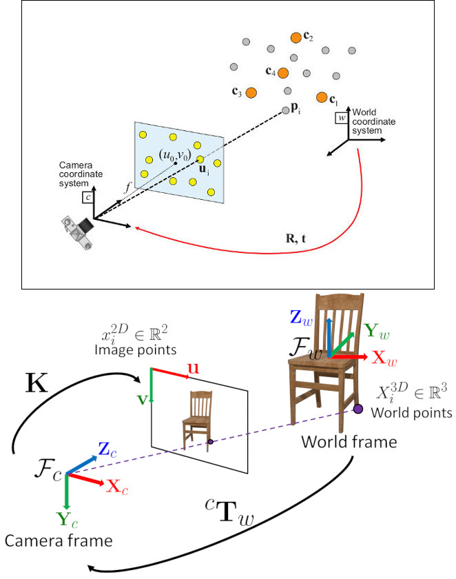 \[ \begin{align*} \begin{bmatrix} u \\ v \\ 1 \end{bmatrix} &= \bf{A} \hspace{0.1em} \Pi \hspace{0.2em} ^{c}\bf{T}_w \begin{bmatrix} X_{w} \\ Y_{w} \\ Z_{w} \\ 1 \end{bmatrix} \\ \begin{bmatrix} u \\ v \\ 1 \end{bmatrix} &= \begin{bmatrix} f_x & 0 & c_x \\ 0 & f_y & c_y \\ 0 & 0 & 1 \end{bmatrix} \begin{bmatrix} 1 & 0 & 0 & 0 \\ 0 & 1 & 0 & 0 \\ 0 & 0 & 1 & 0 \end{bmatrix} \begin{bmatrix} r_{11} & r_{12} & r_{13} & t_x \\ r_{21} & r_{22} & r_{23} & t_y \\ r_{31} & r_{32} & r_{33} & t_z \\ 0 & 0 & 0 & 1 \end{bmatrix} \begin{bmatrix} X_{w} \\ Y_{w} \\ Z_{w} \\ 1 \end{bmatrix} \end{align*} \]