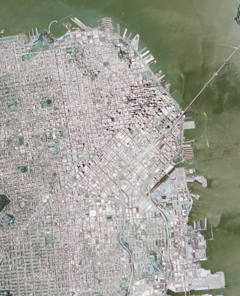 為實現這些目標,以下程式碼將數字高程模型以及舊金山的GeoTiff影像作為輸入。影像和DEM資料經過處理後,生成影像的地形熱力圖,並標註出海灣水位上升10米、50米和100米時會受影響的城市區域。