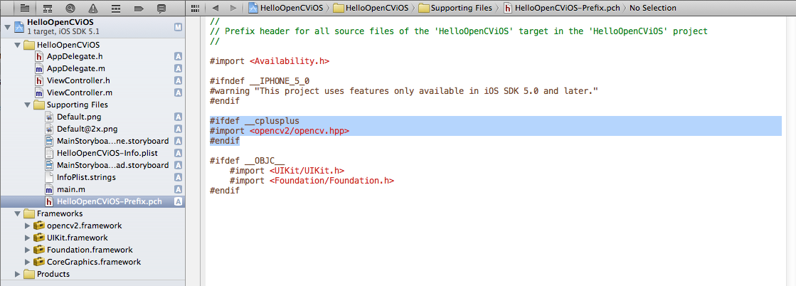 - 開啟名為 NameOfProject-Prefix.pch 的檔案(將 NameOfProject 替換為您的專案名稱),並新增以下程式碼行。