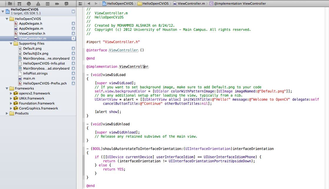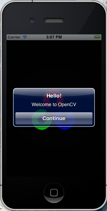 UIAlertView * alert = [[UIAlertView alloc] initWithTitle:@"Hello!" message:@"Welcome to OpenCV" delegate:self cancelButtonTitle:@"Continue" otherButtonTitles:nil];