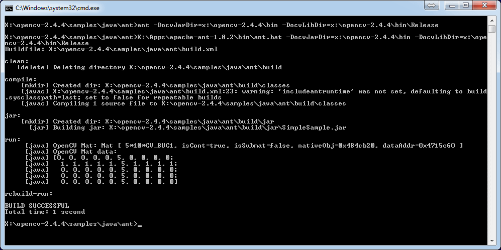 例如ant -DocvJarDir=X:\opencv-2.4.4\bin -DocvLibDir=X:\opencv-2.4.4\bin\Release
