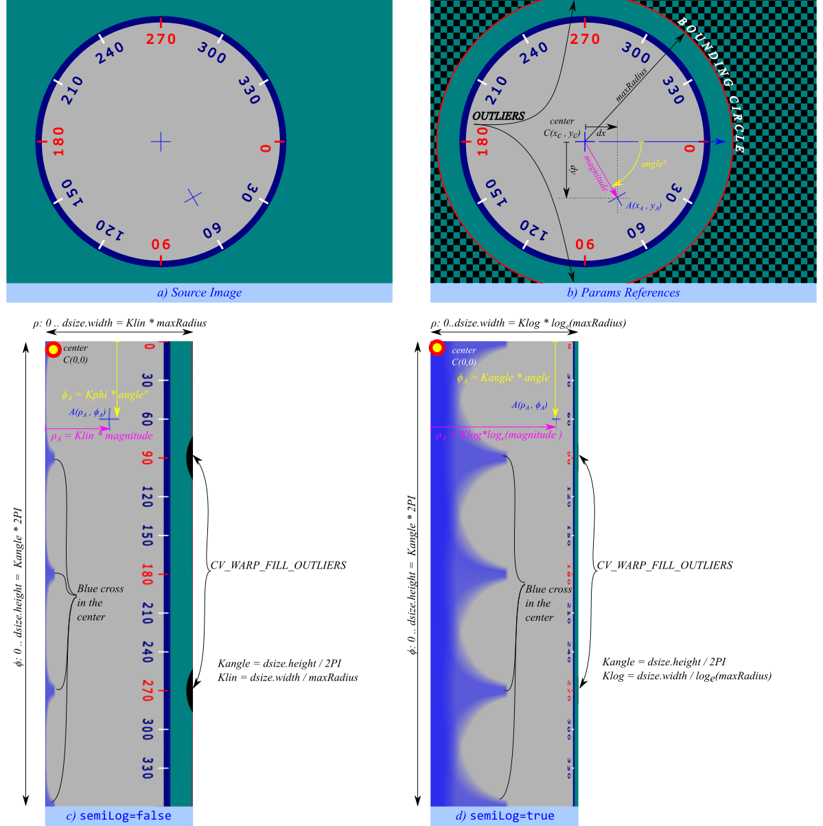 \[ \begin{array}{l} Kangle = dsize.height / 2\Pi \\ Klin = dsize.width / maxRadius \\ Klog = dsize.width / log_e(maxRadius) \\ \end{array} \]