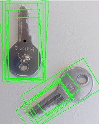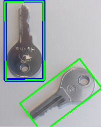 藍色矩形顯示 cv::GeneralizedHoughBallard 的結果,綠色矩形顯示 cv::GeneralizedHoughGuil 的結果。