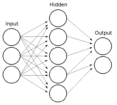ML 實現了前饋人工神經網路,或者更具體地說,多層感知器(MLP),這是最常用的神經網路型別。MLP 由輸入層、輸出層和一個或多個隱藏層組成。MLP 的每一層都包含一個或多個神經元,它們與前一層和下一層的神經元定向連線。下面的示例表示一個3層感知器,具有三個輸入、兩個輸出,以及一個包含五個神經元的隱藏層