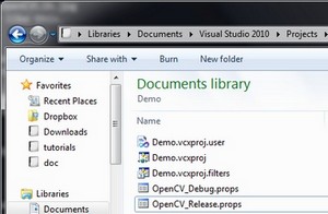 您可以在專案的目錄中找到您的屬性表。 此時,最好將它們備份到一些特殊目錄中,以便將來在您建立 OpenCV 專案時始終可以隨時使用它們。 請注意,對於 Visual Studio 2010,副檔名為 props,而對於 2008,則為 vsprops。