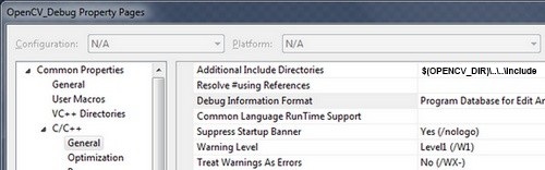 例如,使用 OpenCV_Debug 名稱。 然後透過選擇工作表,右鍵單擊 ->“屬性”。 在下面,我將展示如何在本地設定 OpenCV 規則,因為我認為用我不使用的自定義規則來汙染專案是不必要的。 轉到 C++ 組的“常規”條目,然後在“附加包含目錄”下新增 OpenCV include 的路徑。 如果您沒有“C/C++”組,則應向專案新增任何 .c/.cpp 檔案。