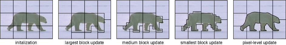 該演算法使用一種高效的爬山演算法來最佳化超畫素的能量函式,該函式基於顏色直方圖和一個可選的邊界項。能量函式鼓勵超畫素具有相同的顏色,如果邊界項被啟用,則超畫素具有平滑的邊界並且形狀相似。實際上,它從超畫素的規則網格開始,並移動邊界上的畫素或畫素塊以細化解決方案。該演算法使用單個 CPU 即時執行。